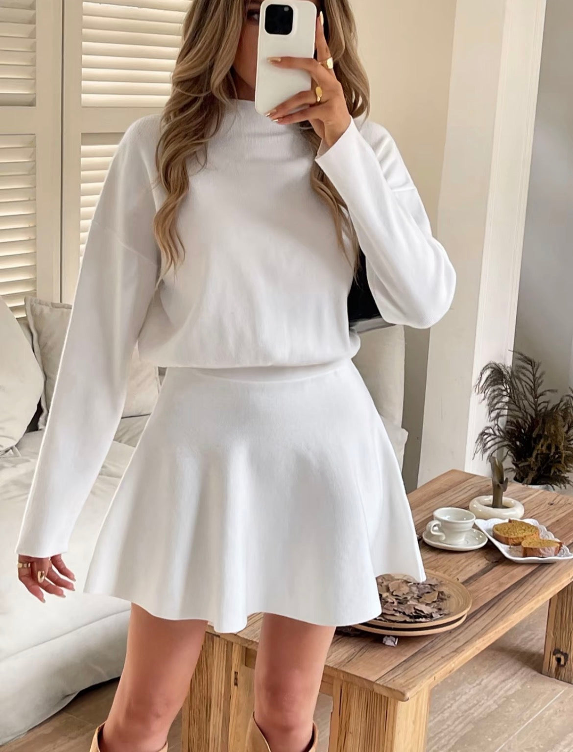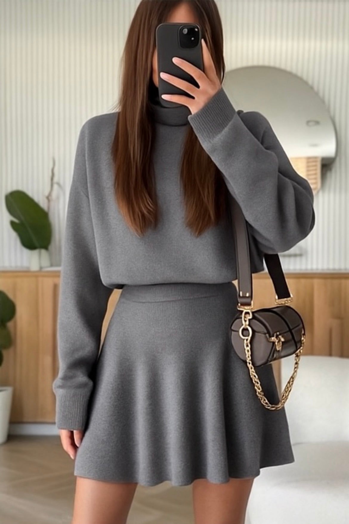 go-to for effortless style and comfort. Designed with a high-neck top and a matching knit skirt, this set features a smooth, solid-color finish that instantly elevates your look. The relaxed yet flattering fit moves with you—perfect for staying cozy in cooler weather and stylish in warmer seasons.
